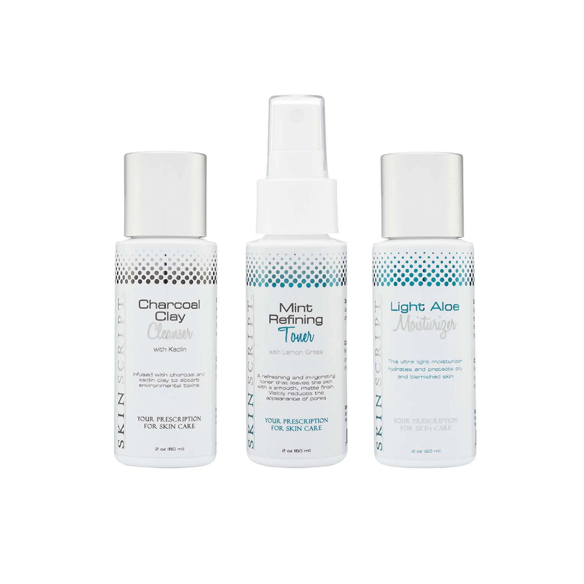 These three products are designed for normal to combination skin. The Charcoal Clay Cleanser will help absorb oil and toxins from the skin with a gentle foamy cleanse without over drying the skin. The Mint Refining Toner will minimize pores and calm the skin. The Light Aloe Moisturizer, even for oily skin, is needed to seal in water to balance surface lipids.